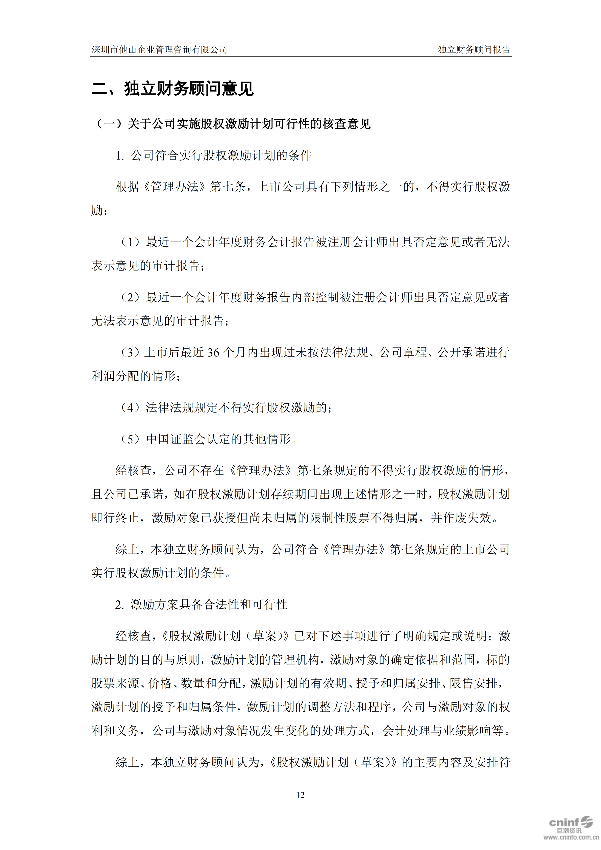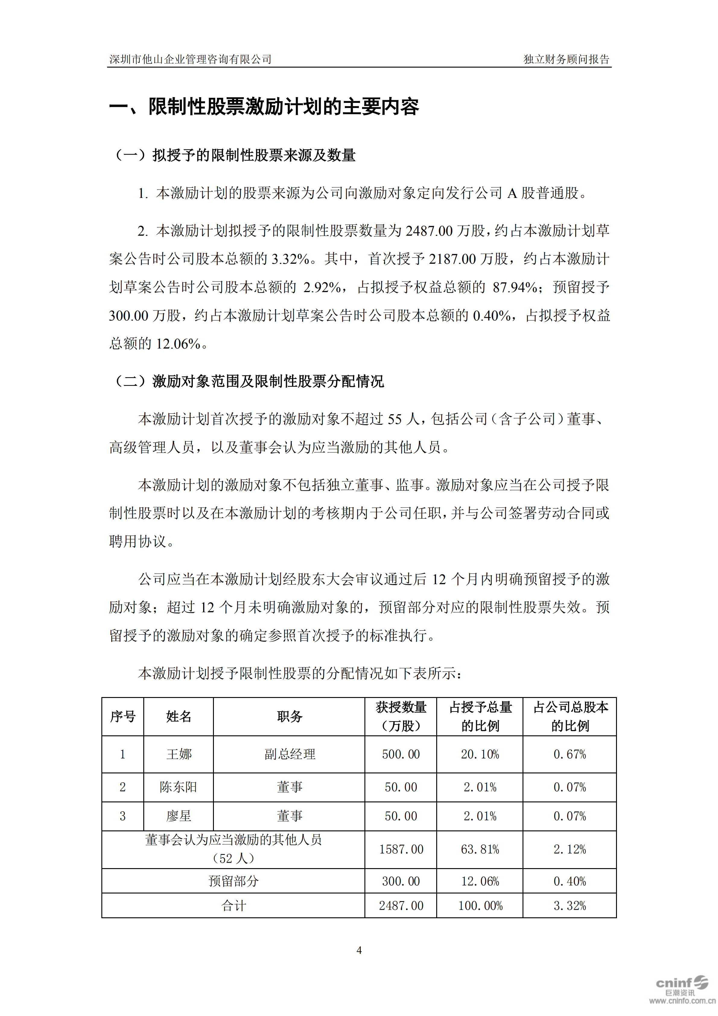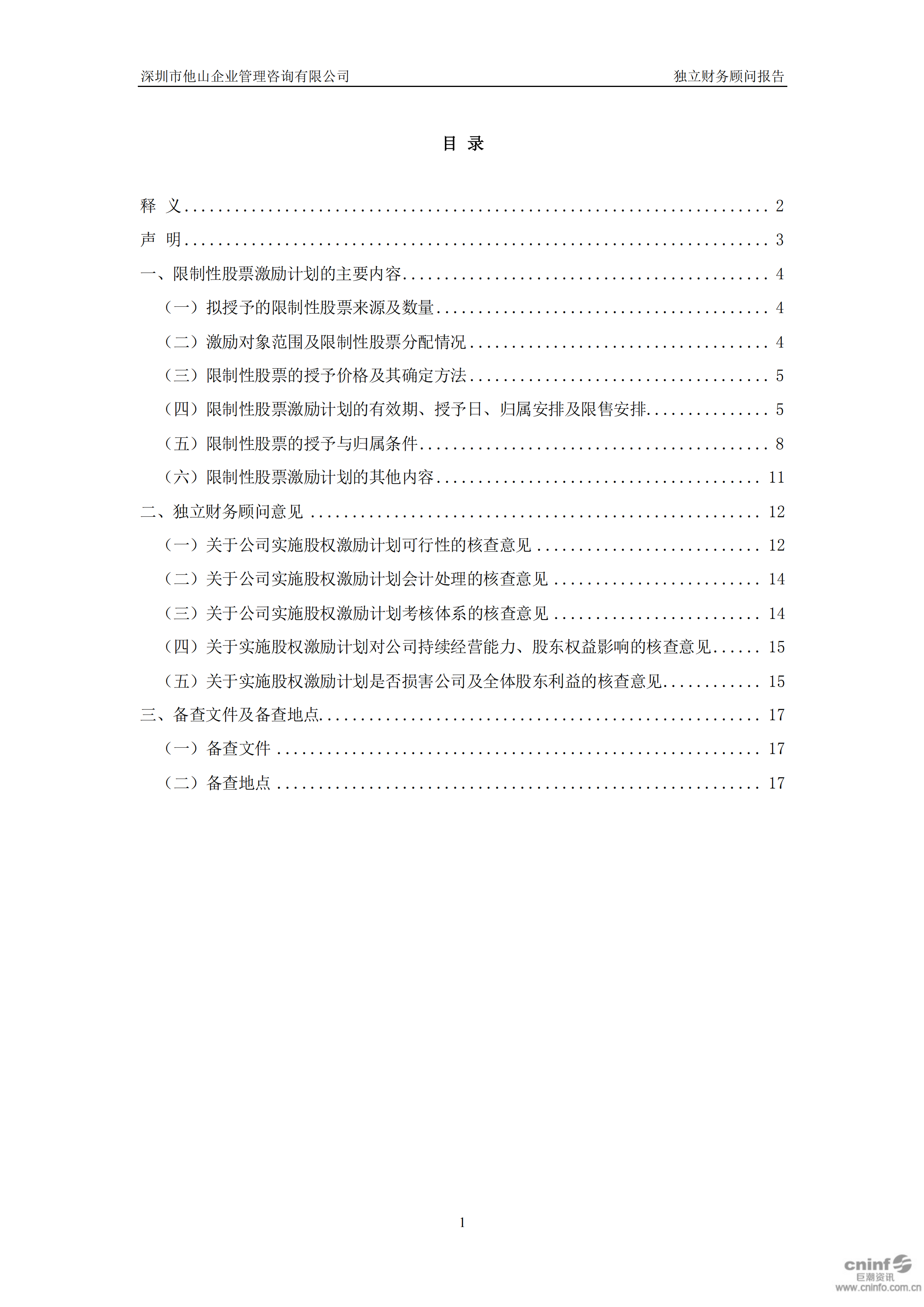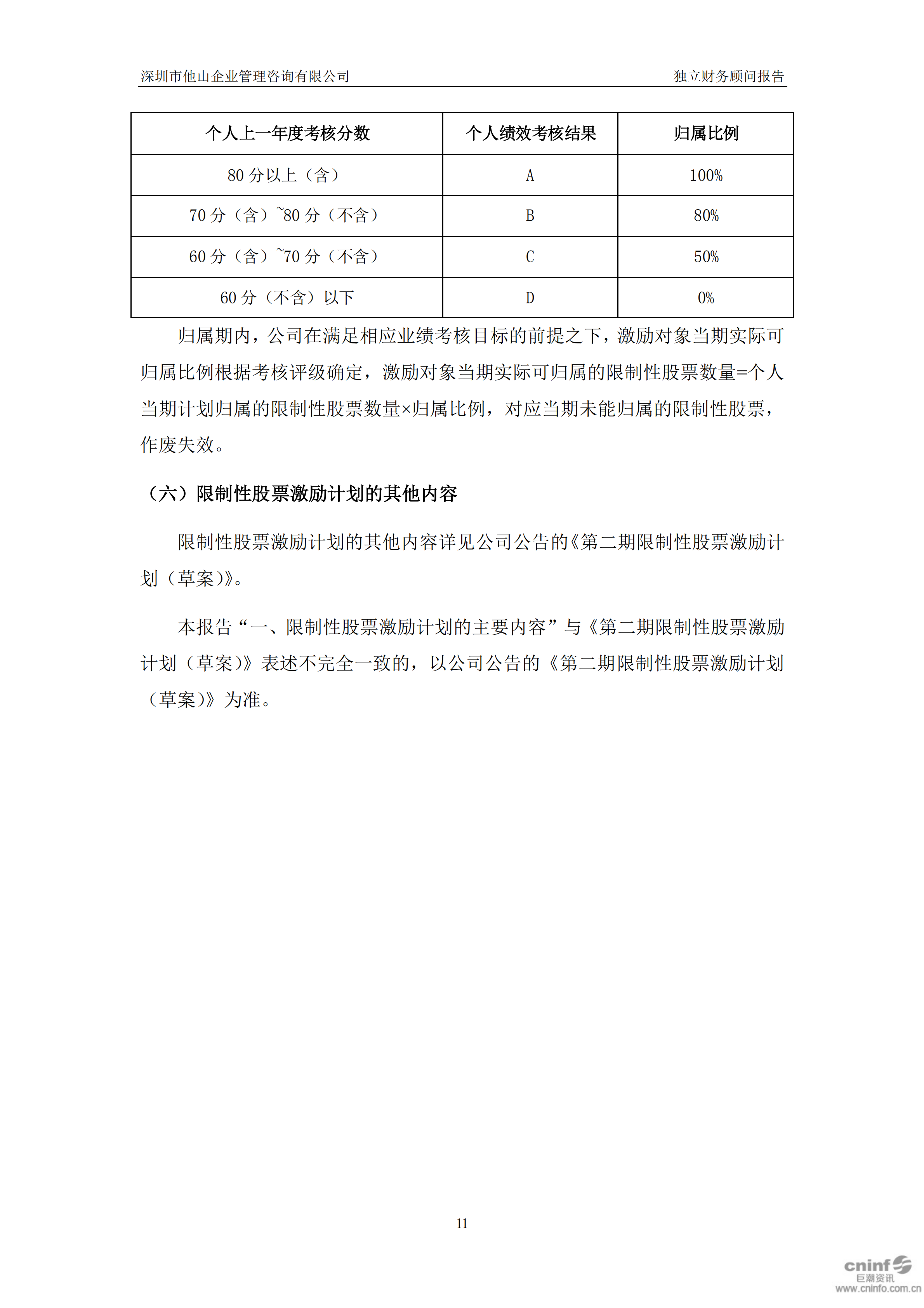深圳市他山企業管理咨詢有限公司關于公司第二期限制性股票激勵計劃(草案)的獨立財務顧問報告
