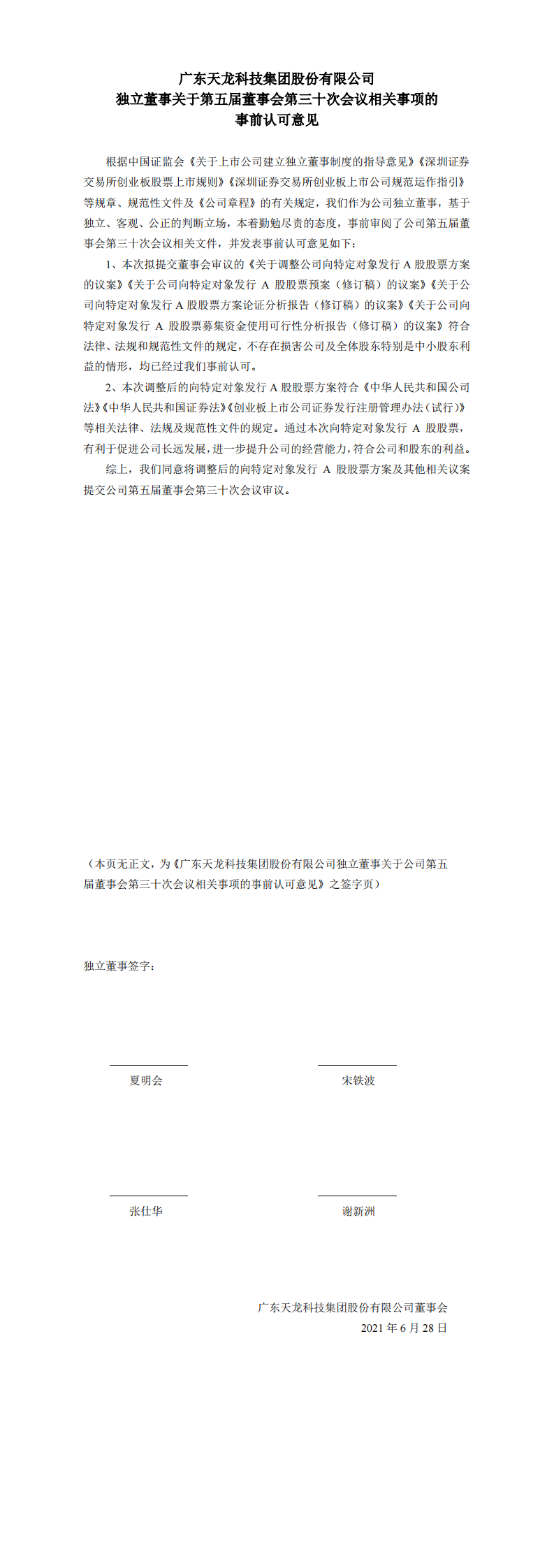 廣東天龍科技集團股份有限公司獨立董事關于公司第五屆董事會第三十次會議相關事項的事前認可意見