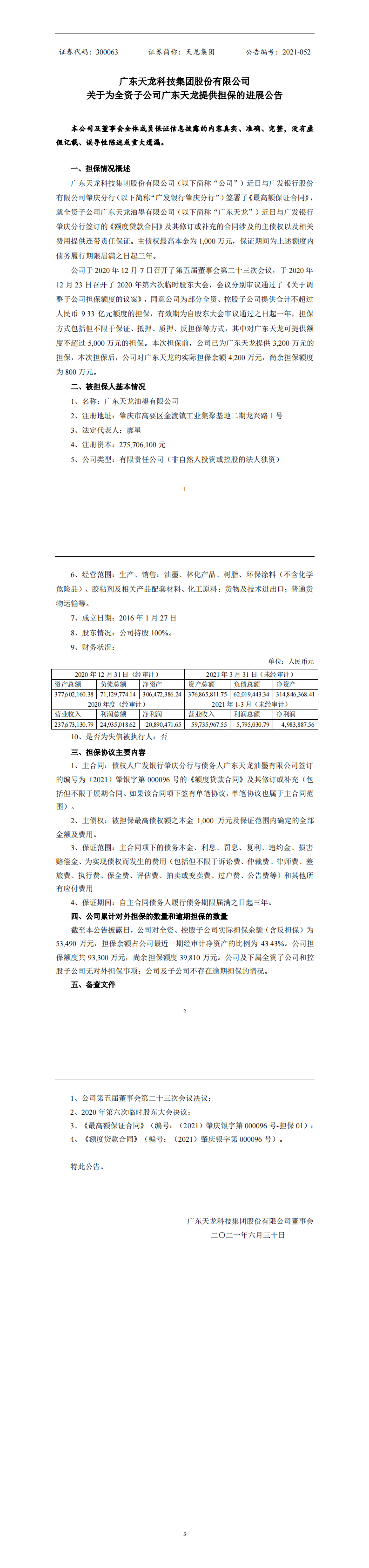 關(guān)于為全資子公司廣東天龍?zhí)峁?dān)保的進(jìn)展公告