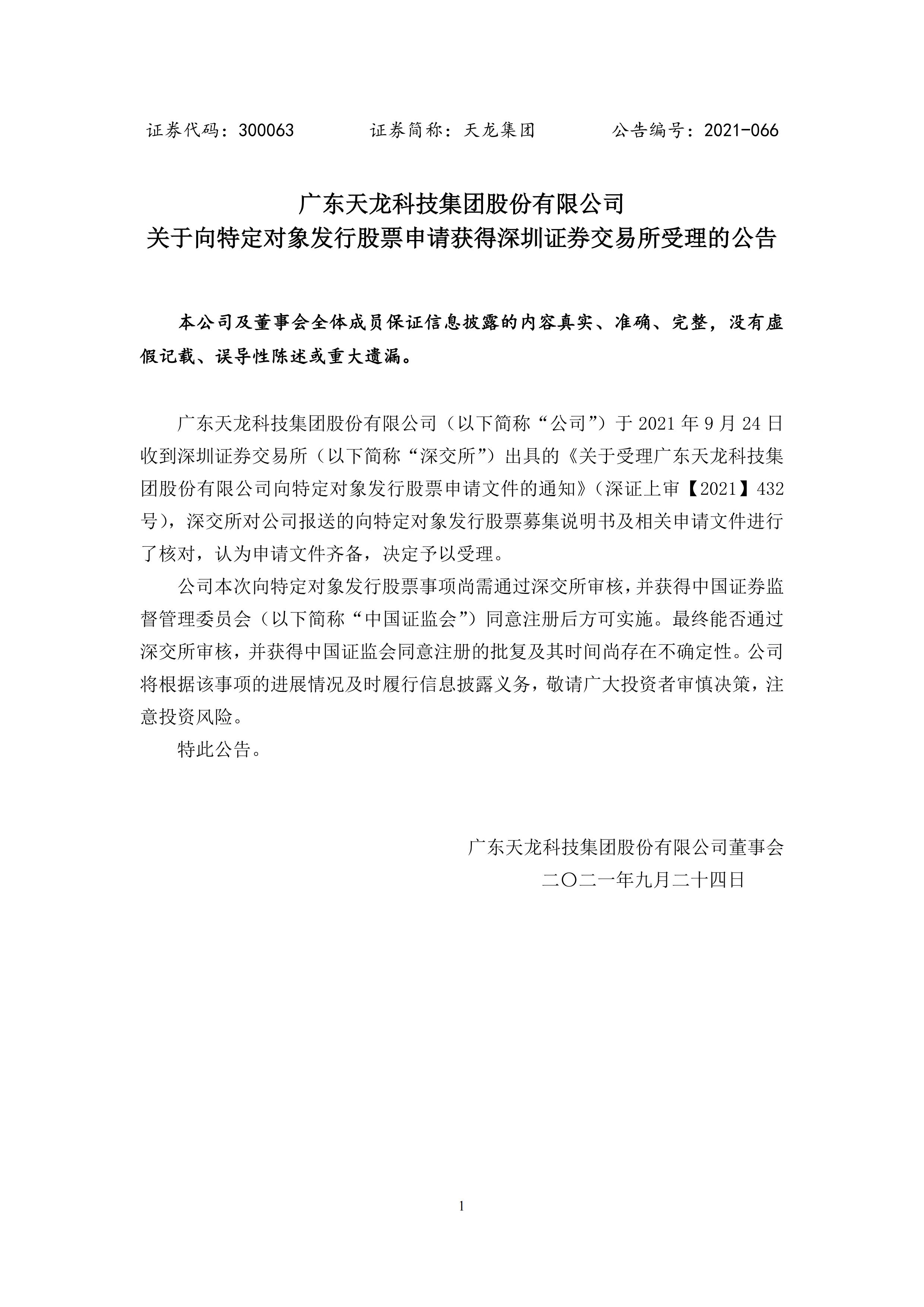 關于向特定對象發行股票申請獲得深圳證券交易所受理的公告