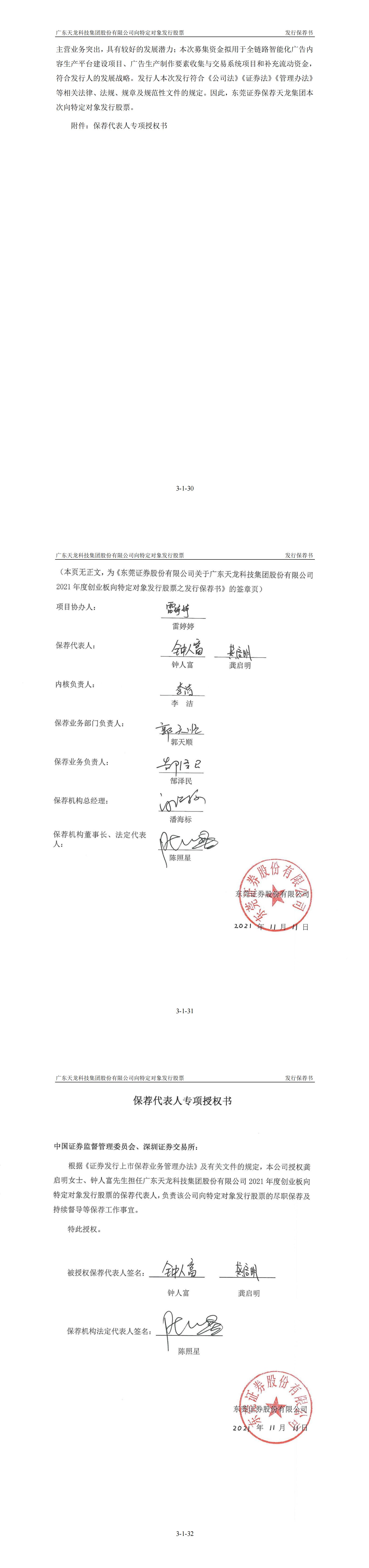 東莞證券關于廣東天龍科技集團股份有限公司2021年度創業板向特定對象發行股票之發行保薦書