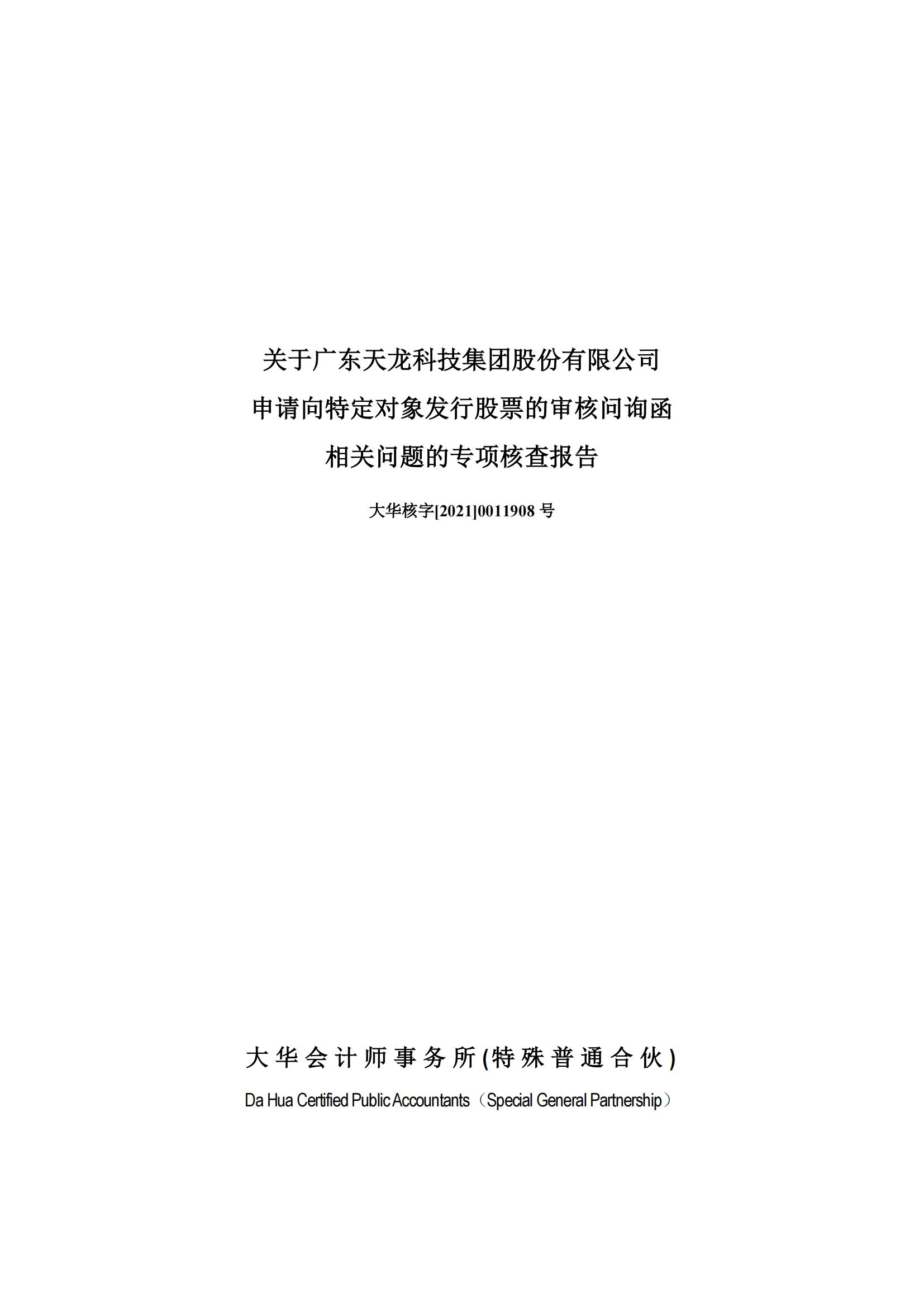大華會(huì)計(jì)師事務(wù)所關(guān)于廣東天龍科技集團(tuán)股份有限公司申請(qǐng)向特定對(duì)象發(fā)行股票的審核問(wèn)詢函相關(guān)問(wèn)題的專項(xiàng)核查報(bào)告