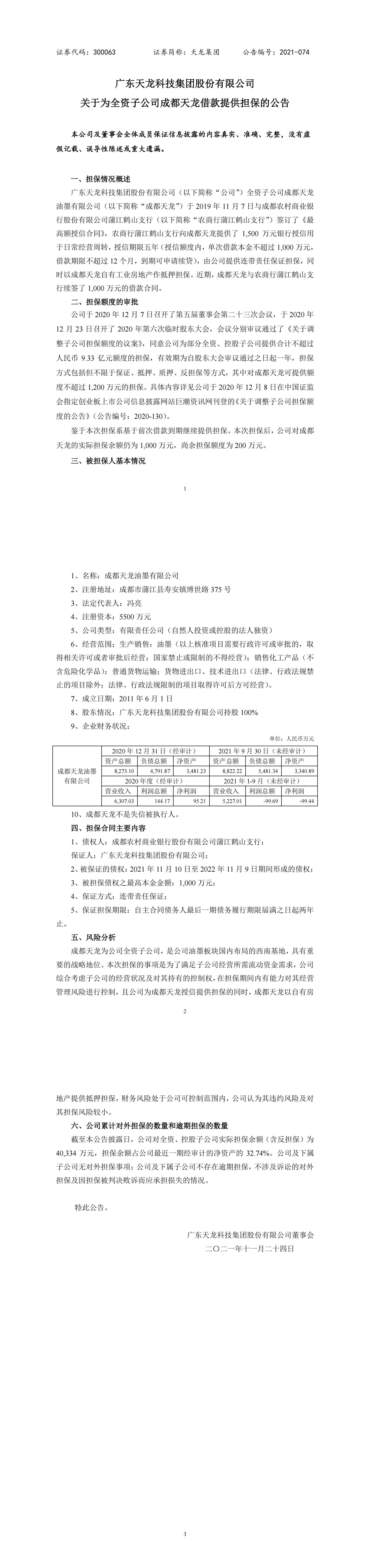 關(guān)于為全資子公司成都天龍借款提供擔保的公告