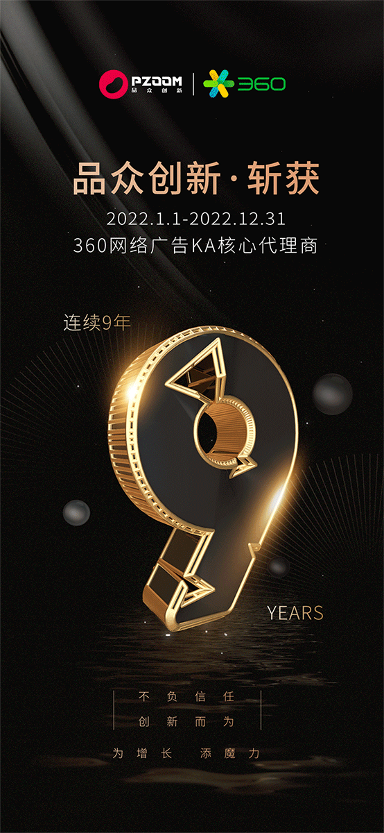 品眾創新連續九年,斬獲360網絡廣告KA核心代理商。多年的深度合作讓雙方建立了堅實穩固的合作關系。