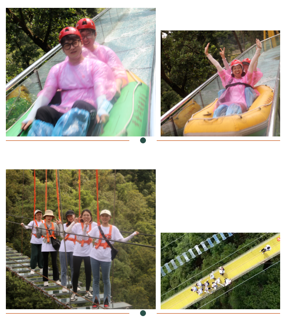 下午14點,大家盡情在因當地村民曾在此采沙掏金而得名"黃金溝"自由游玩。黃金溝與鼎湖山風景區一脈相連,氣候溫和,雨量充足,瀑布成群,山高林密,古木蔥蘢,鳥語花香,動植物種類繁多,負離子含量高,能與大自然零距離接觸,沁人心脾。景區內峽谷幽深崎嶙,懸崖峭壁,古樹蔥蔥,有黃金九瀑、金蟬納福、黃金石等、一步一景。空中玻璃漂流滑道全長1000米,上下端落差99米,全程玻璃高架,數道穹道回旋,氣勢磅礴。大家無懼高空滑道,順流而下;笑聲、水聲、尖叫聲此起彼伏,游玩中突破自我極限,展示天龍人勇于創新,敢于挑戰的精神。