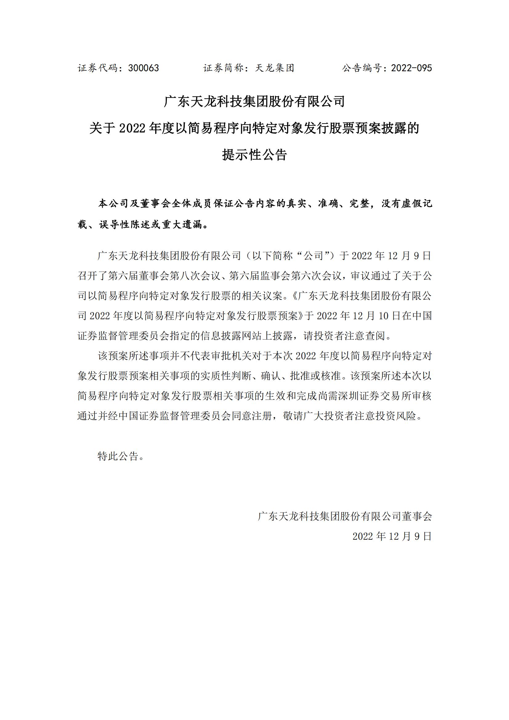 廣東天龍科技集團(tuán)股份有限公司關(guān)于2022年度以簡易程序向特定對象發(fā)行股票預(yù)案披露的提示性公告