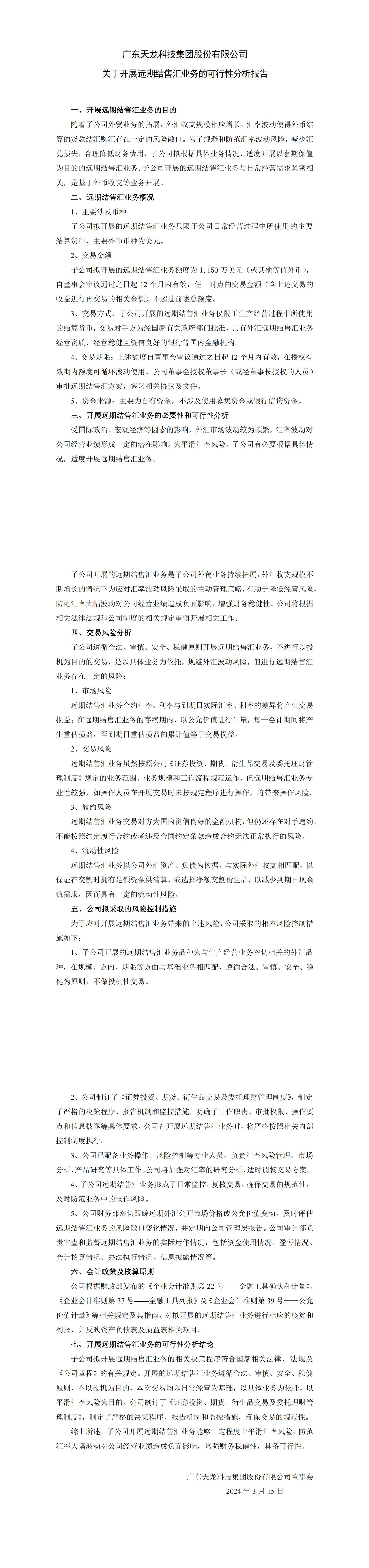 廣東天龍科技集團股份有限公司關于開展遠期結售匯業務的可行性分析報告