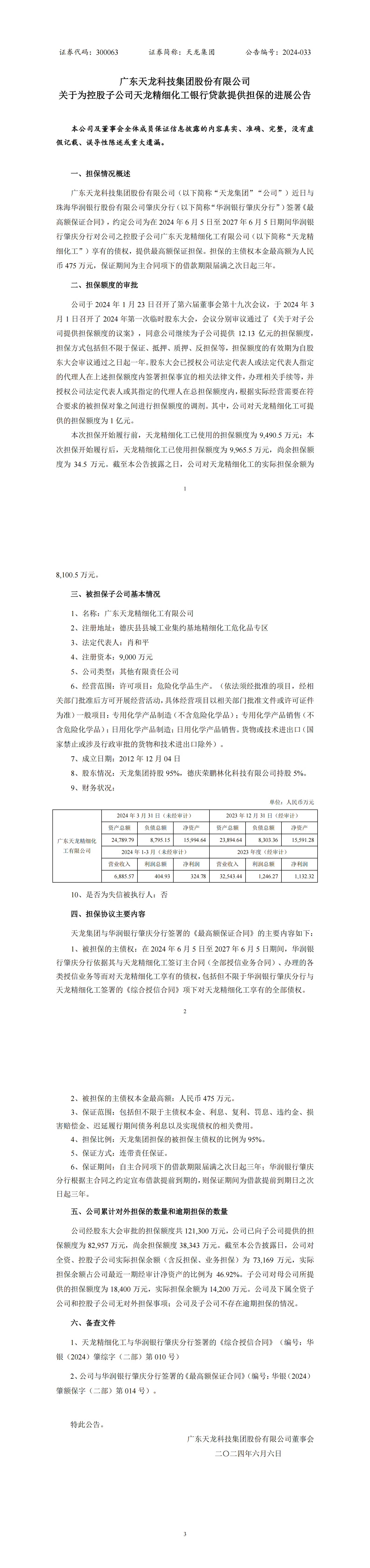 關(guān)于為控股子公司天龍精細(xì)化工銀行貸款提供擔(dān)保的進(jìn)展公告
