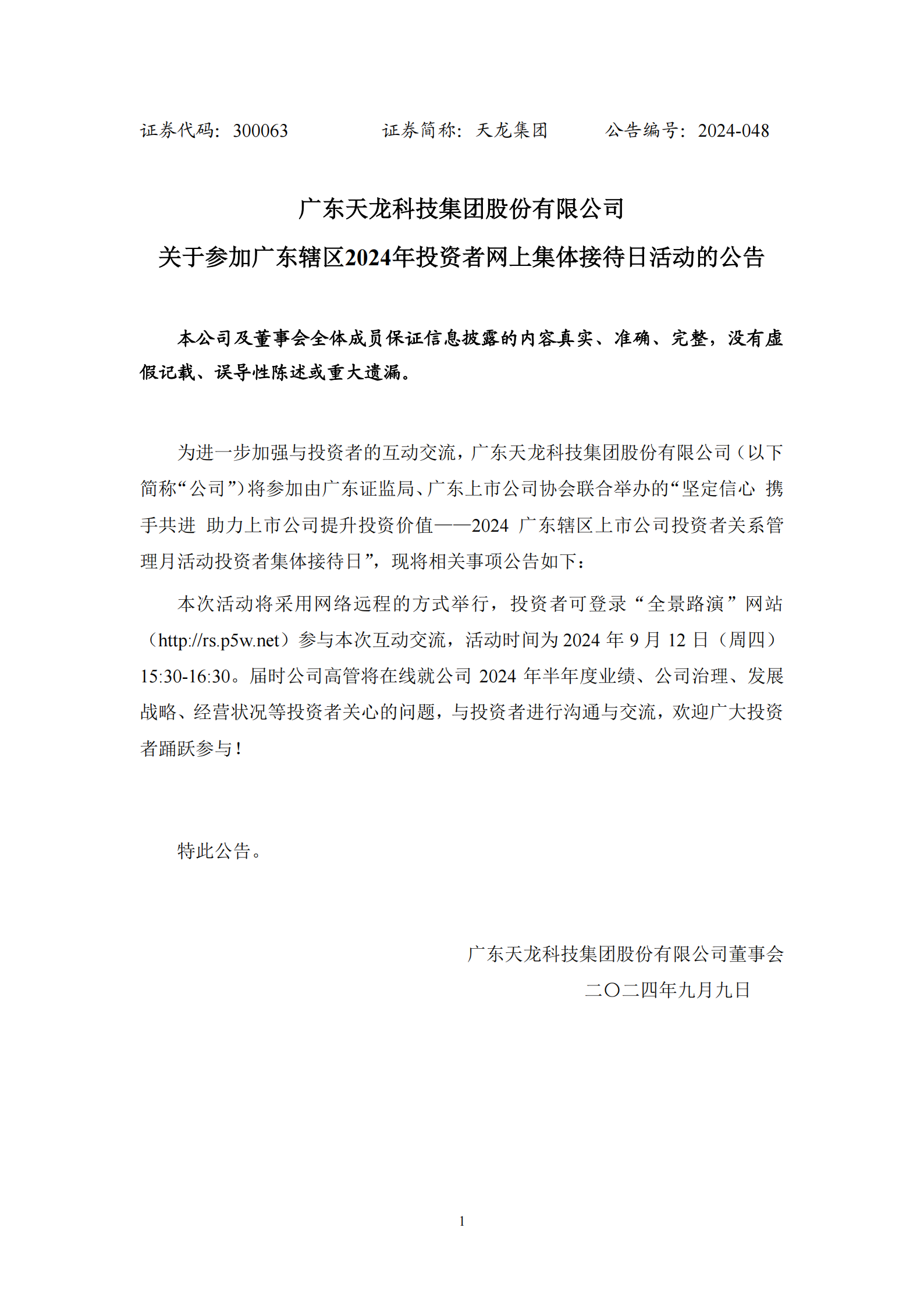 關(guān)于參加廣東轄區(qū)2024年投資者網(wǎng)上集體接待日活動(dòng)的公告