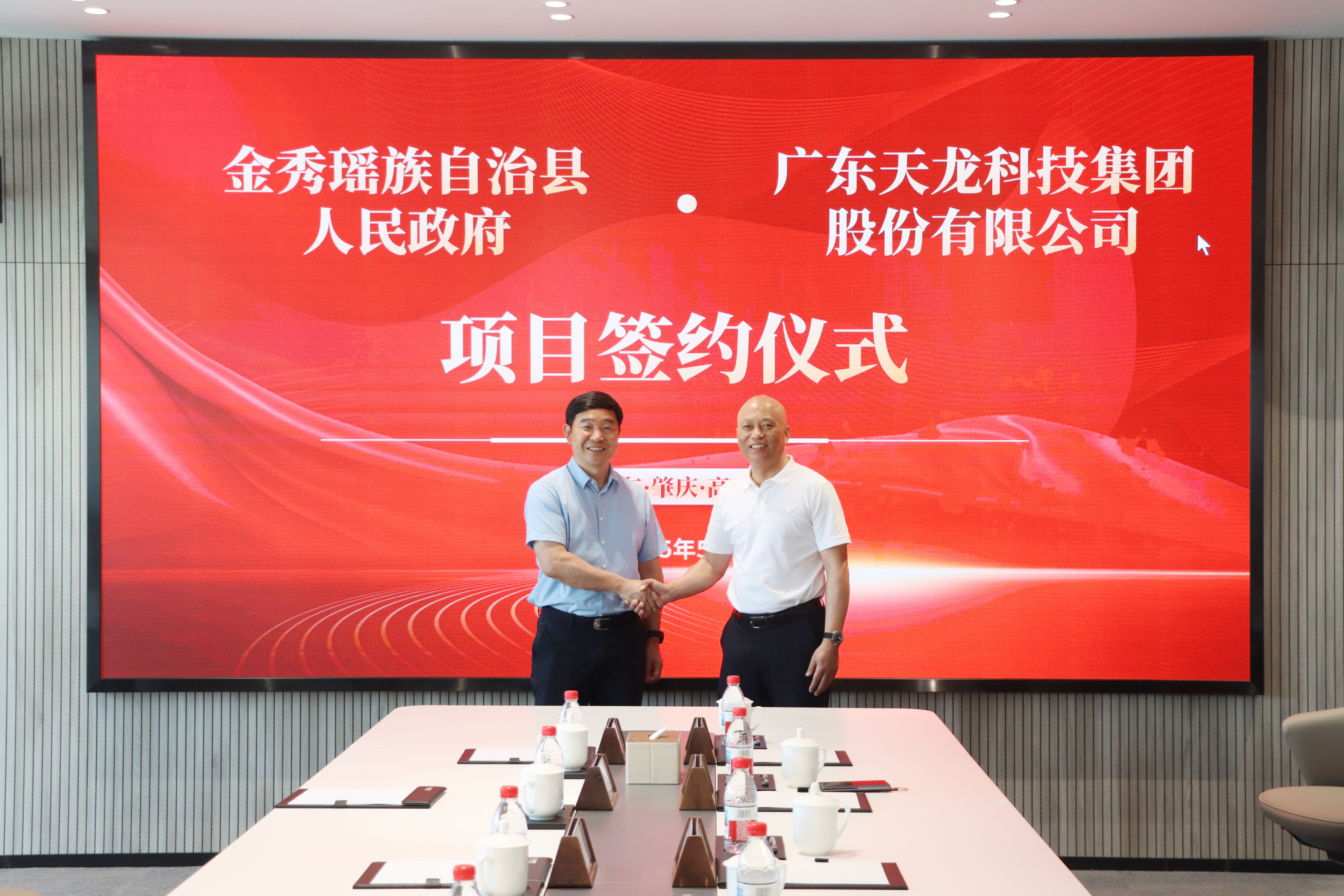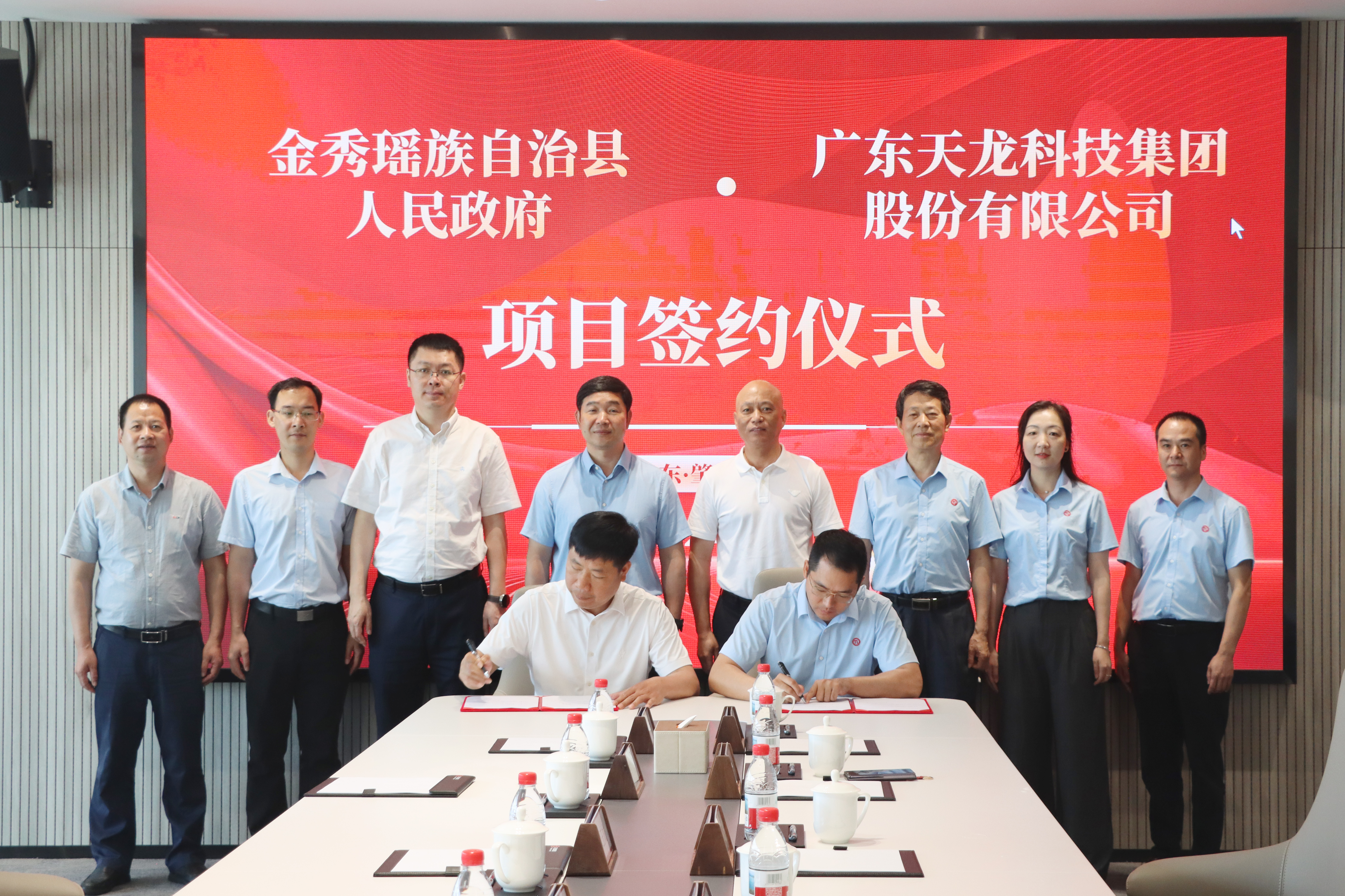 2025年5月12日,廣東天龍科技集團股份有限公司(以下簡稱“天龍集團”)旗下子公司廣西金秀松源林產有限公司(以下簡稱“金秀松源”)與廣西金秀瑤族自治縣人民政府在天龍大廈隆重舉行項目簽約儀式。