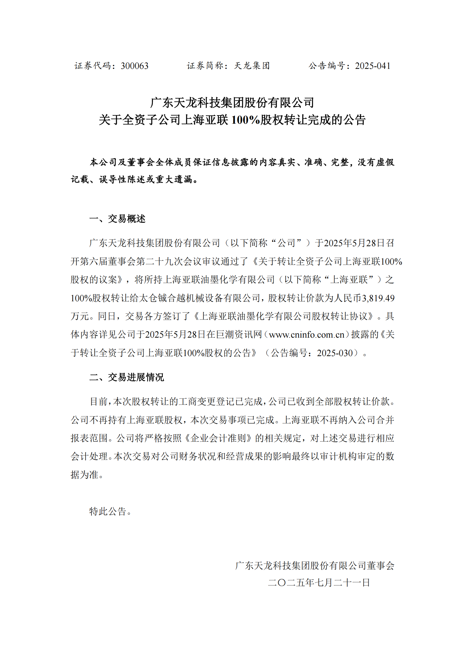 關于全資子公司上海亞聯100%股權轉讓完成的公告