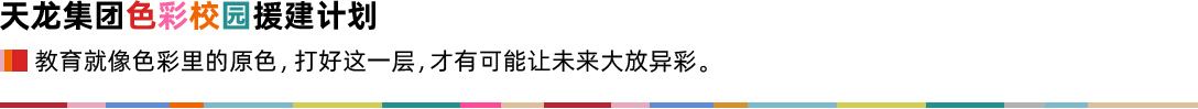天龍集團多年致力于慈善助學,作為一家經營油墨的企業,環保與色彩是天龍集團的企業形象。校園是學生求學時代的主要活動空間,用絢麗色彩美化心情,用健康理念美化生活,為貧困山區學校提供美化校園援助, 2019年6月1日,值六一國際兒童節之際,啟動“天龍色彩校園援建計劃”。