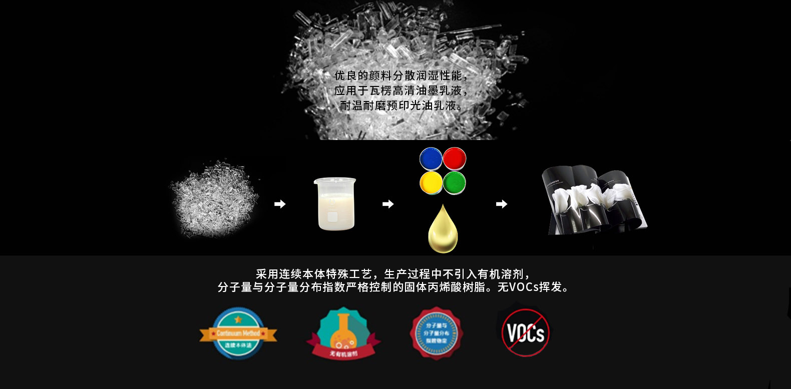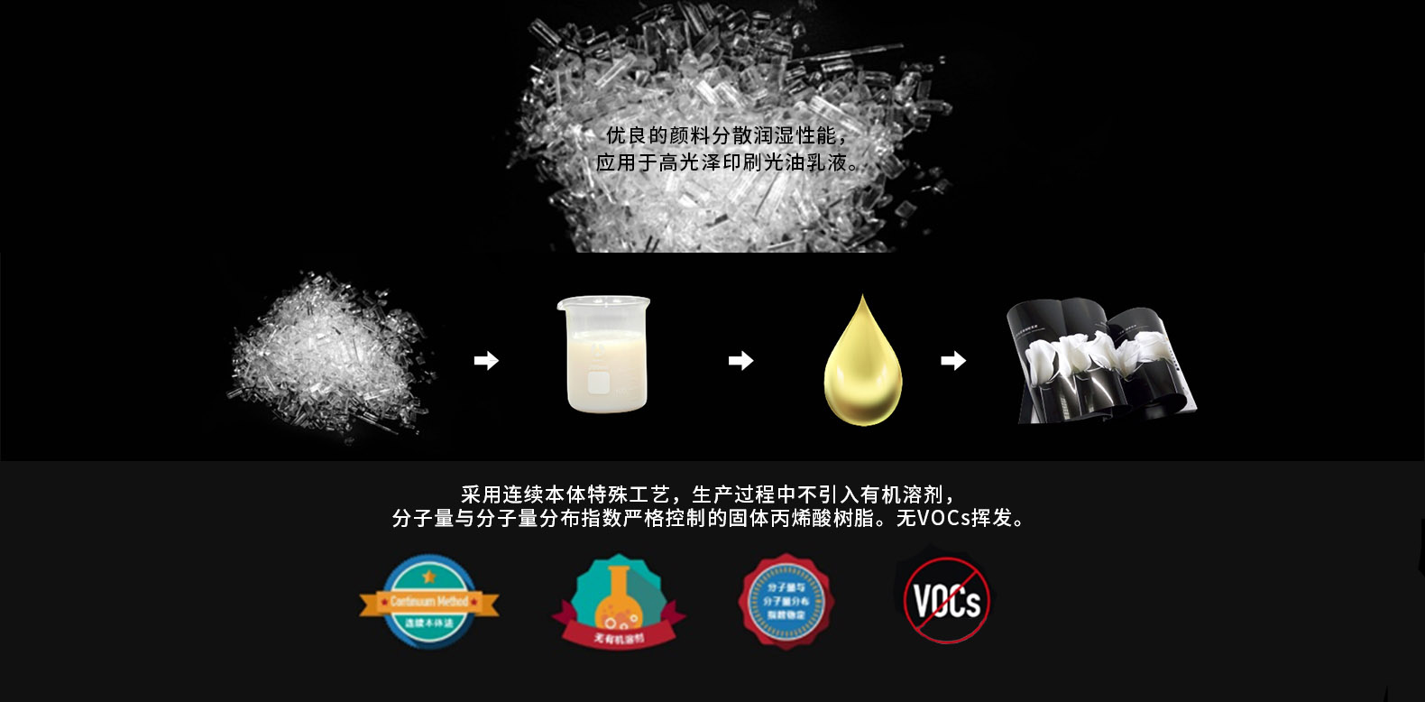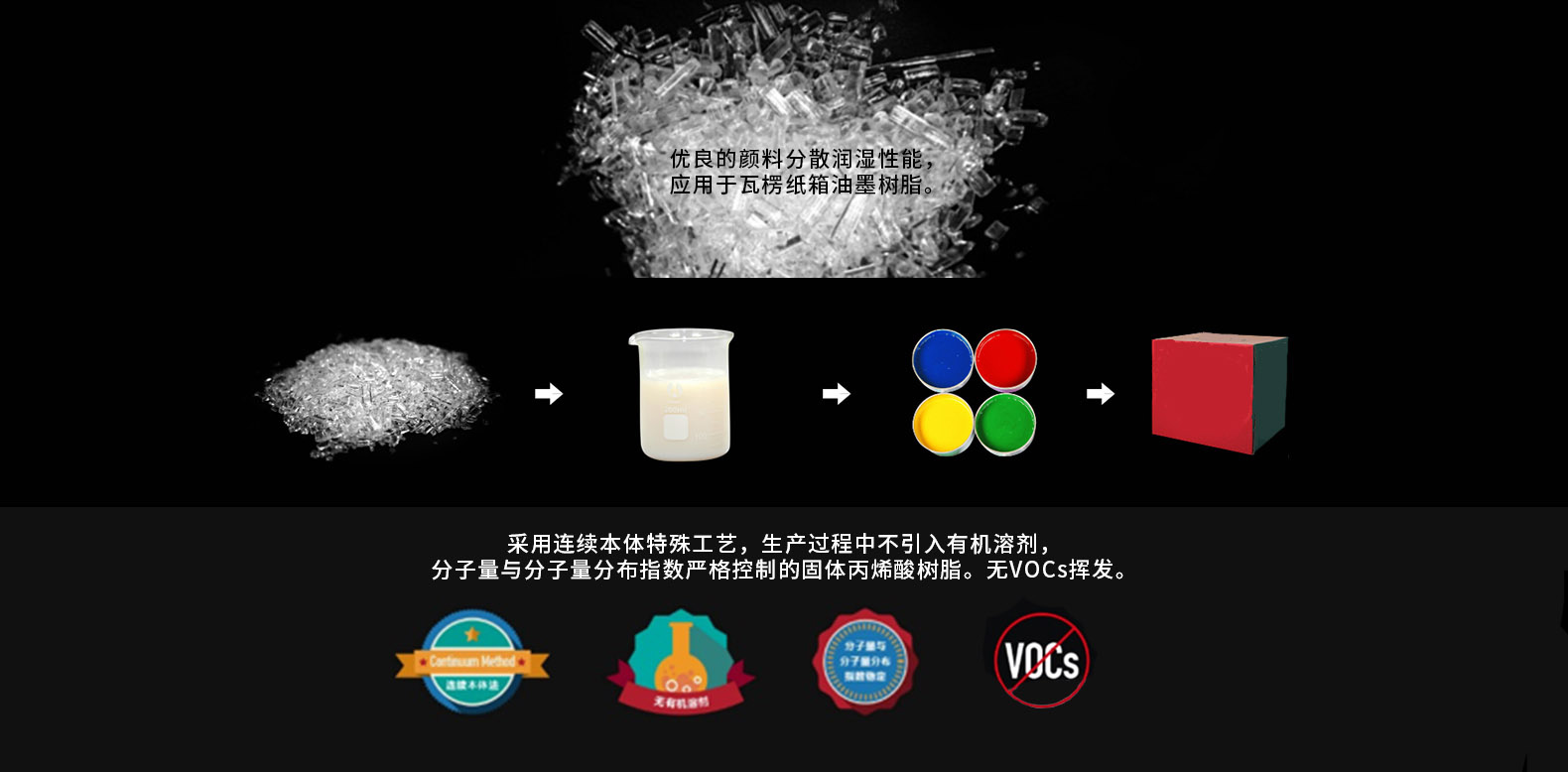采用特殊工藝,生產過程中不引入有機溶劑,分子量與分子量分布指數嚴格控制的固體丙烯酸樹脂,優良的顏料分散潤濕性能,主要用于水性油墨色漿,水性上光油。