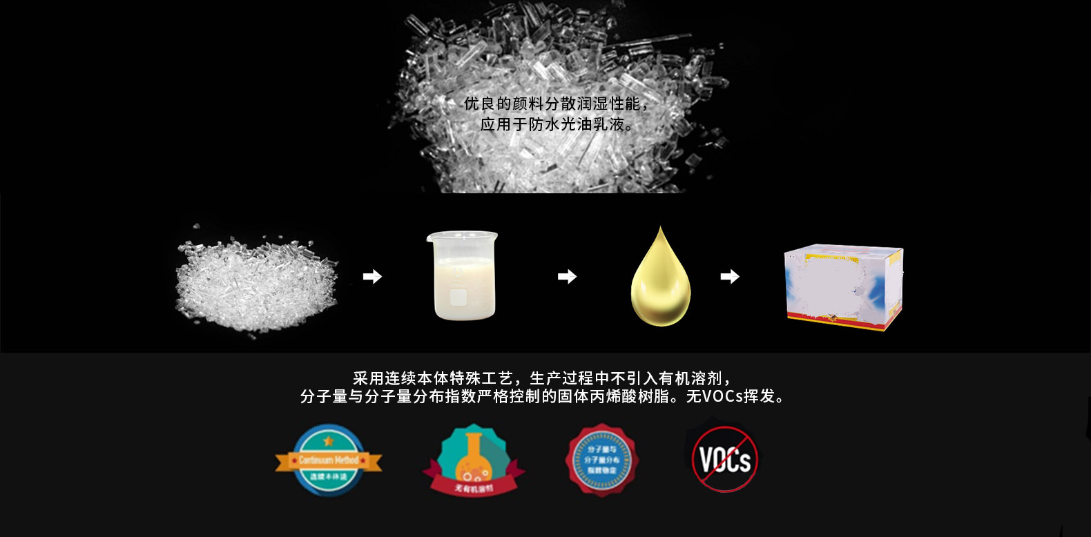 采用特殊工藝,生產過程中不引入有機溶劑,分子量與分子量分布指數嚴格控制的固體丙烯酸樹脂,優良的顏料分散潤濕性能,主要用于低固含量水性苯丙乳液的制備。