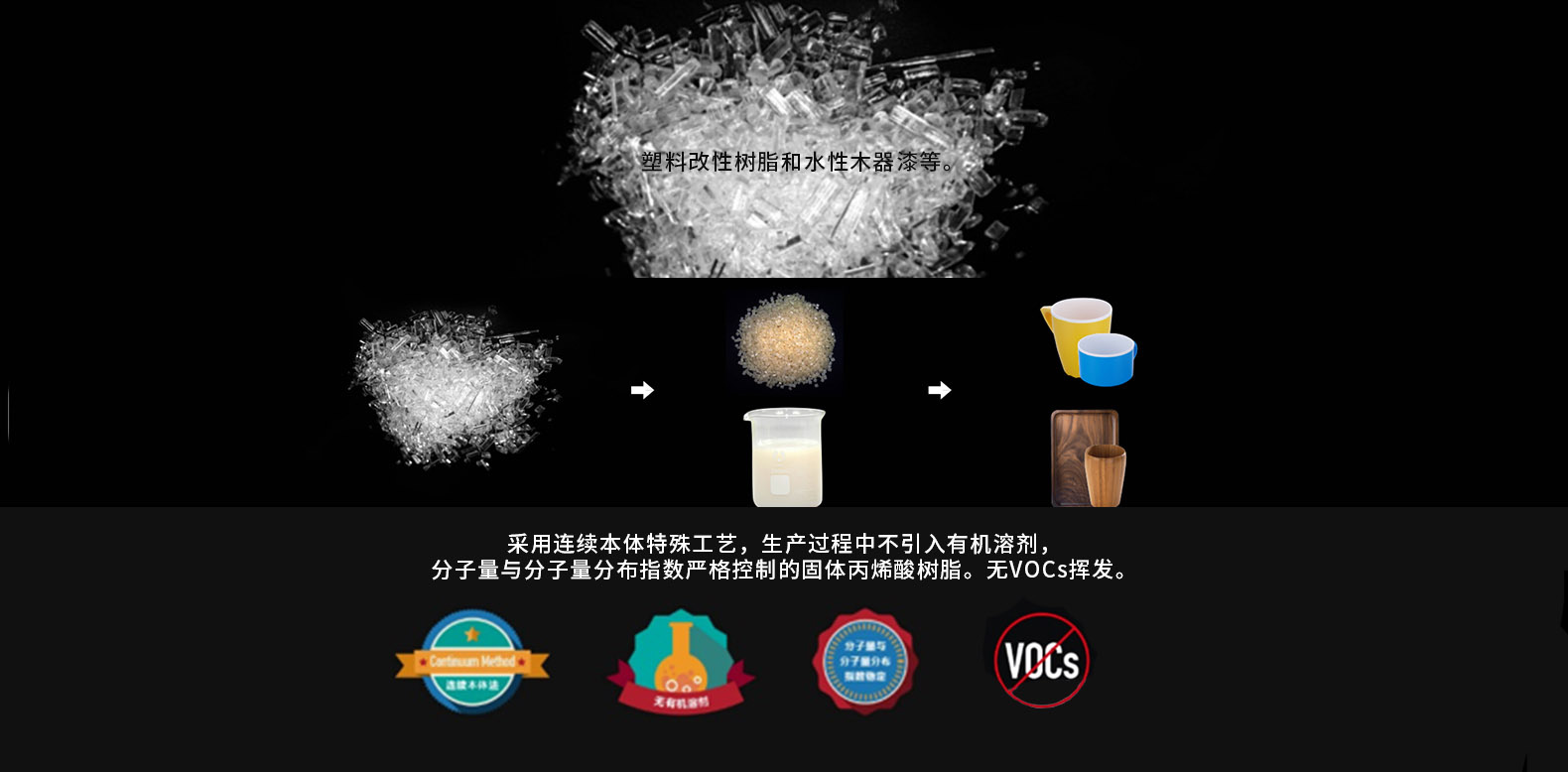 采用特殊工藝,生產過程中不引入有機溶劑,分子量與分子量分布指數嚴格控制的馬來酸酐改性丙烯酸樹脂,主要用于耐溫乳液合成和預印水性油墨/上光油制備,以及塑料改性和水性木器漆等相關領域。